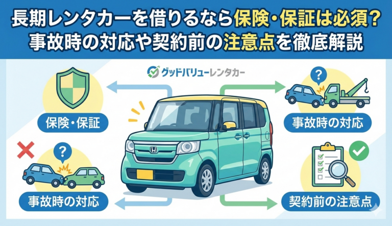 長期レンタル中の保険・保証は?事故時の対応など、契約前に知っておきたいこと【グッドバリューレンタカー御殿場】 2026年2月18日 御殿場エリアで1か月以上の長期レンタカーを検討する際、多くの方が最も不安に感じるのが「保険・保証の内容」です。「万が一事故を起こしたら自己負担はいくら?」「修理中に代車は借
